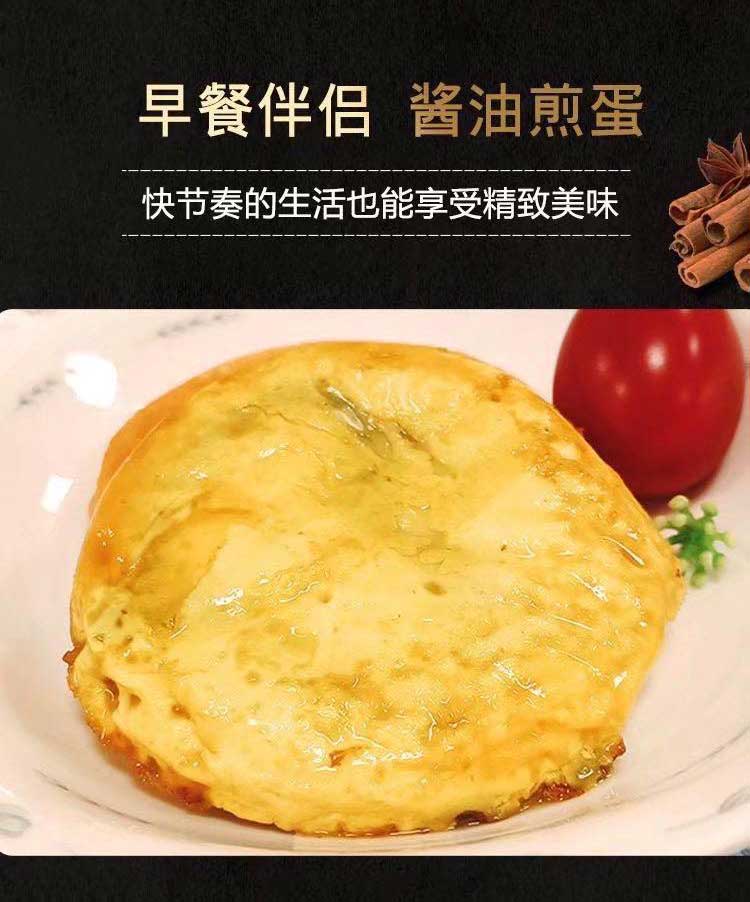 ????對于許多人來講,早飯都會有煎蛋,但由于早晨時間較緊,并沒有太多的時間去做早飯,因此我公司推出了真空包裝的醬油煎蛋,食用時只需簡單加熱,而且攜帶方法,保質(zhì)期長。當然,在家中自己做醬油煎蛋的話,整個過程也并不復(fù)雜。
